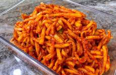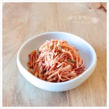 무는 껍질을 벗기고 5cm 길이로 자른 뒤 얇고 균일하게 채썰어야 합니다. 채가 두꺼우면 양념이 고루 배지 않고 식감이 뻣뻣해질 수 있어요. 얇게 썰면 양념이 잘 배고 씹을 때 아삭한 소리가 납니다. 채칼을 사용하면 손쉽고 균일하게 썰 수 있습니다.