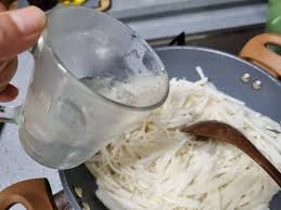 채 썬 무를 넣고 살짝 볶아 주세요. 무가 투명해지기 시작하면 수분이 나오며 부드러워져요. 처음부터 오래 볶지 않는 것이 좋아요.