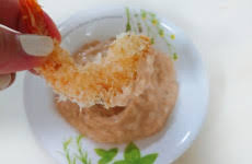 얇게 가루가 묻은 새우를 얼음물 반죽에 담가 골고루 묻혀줍니다. 반죽이 너무 두껍게 붙지 않도록 흔들듯이 들어 올려 약간 떨어뜨리는 것이 좋습니다.