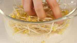 콩나물을 쌀 위에 골고루 올려 주세요. 섞지 말고 그대로 두어야 콩나물이 숨을 유지해요.